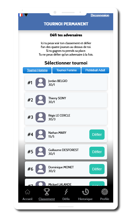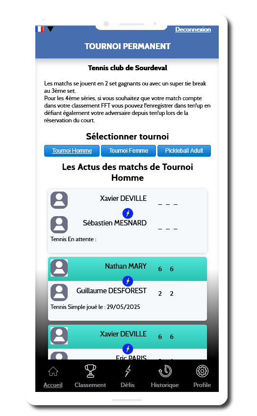 Les joueurs se connectent et gèrent leurs défis via notre application Tournoi Permanent !